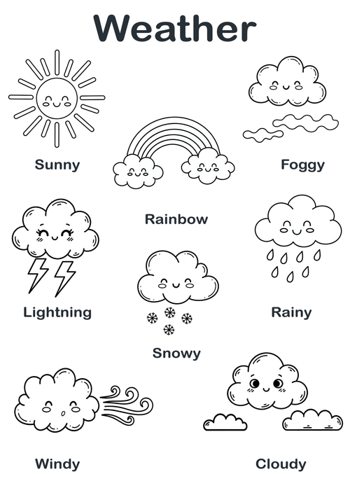 This black‑and‑white worksheet includes sunny, rainy, cloudy, snowy, windy, foggy, lightning, and rainbow.