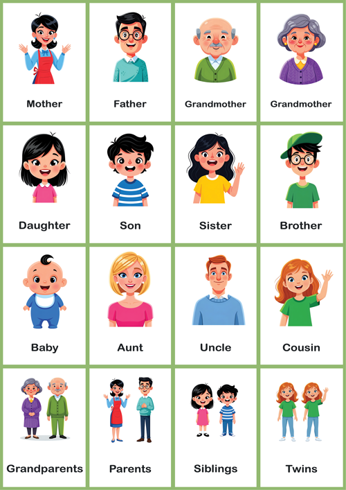 This free printable flashcards set helps young learners master the most common family members vocabulary in English with bright, child-friendly illustrations and clear text.