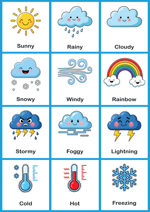 Vocabulary included: sunny, rainy, cloudy, snowy, windy, rainbow, stormy, foggy, lightning, cold, hot, freezing.