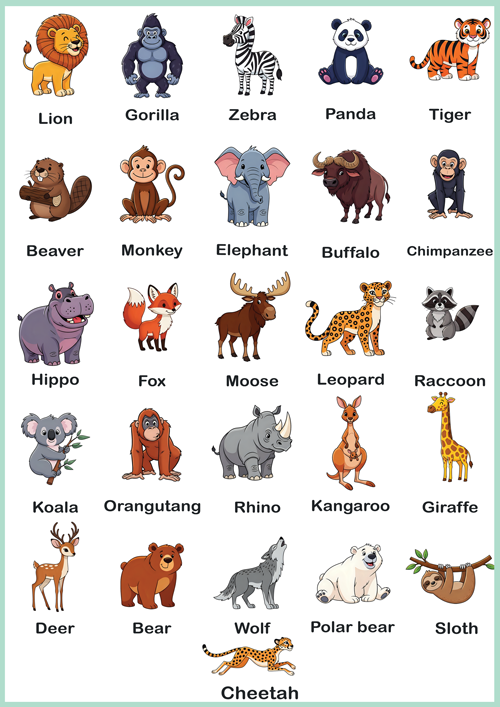 lion, gorilla, zebra, panda, tiger, beaver, monkey, elephant, buffalo, chimpanzee, hippo, fox, moose, leopard, raccoon, koala, orangutang, rhino, kangaroo, giraffe, deer, bear, wolf, polar bear, sloth, cheetah.